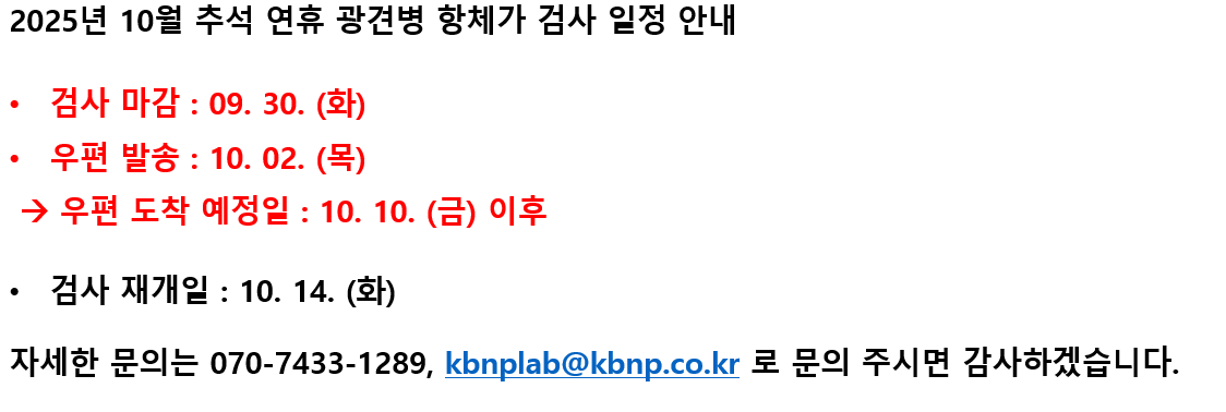25년 10월 추석 연휴 광견병 항체가 검사 일정 공지